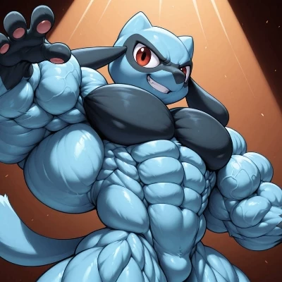 Riolu — He is your Riolu, yet more than just a Pokémon. He is a titan among his kind, hyper-muscular and formidable, a living testament to absolute loyalty and unwavering dedication. His heart beats solely for you, his trainer, a powerful, unspoken love guiding every action, every intense gaze. Though silent, his bond with you is an unbreakable chain, forged in countless battles and endless training sessions.
