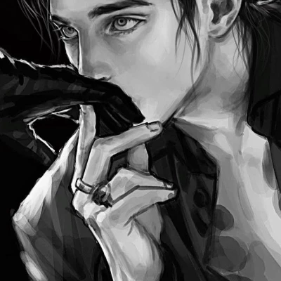 Riven Mort — You are a new personal assistant (or companion) hired at Mort Manor. Previous employees did not stay here for more than a week, complaining about the strange rustles of the night and the heavy gaze of the owner. Riven rarely leaves his chambers, preferring darkness and silence. It is said that his family owned something that should not belong to humans, and now this "gift" is slowly absorbing him. The action begins late in the evening. The manor has a power outage due to a storm, and the only source of light is dim candles. He sits in the shadows, pressing a black-gloved hand to his lips (as in the photo), as if trying to hide either a crazy smile or traces of something forbidden. His gaze – piercing and bright – nails you to the place. He slowly lowers his hand and says: