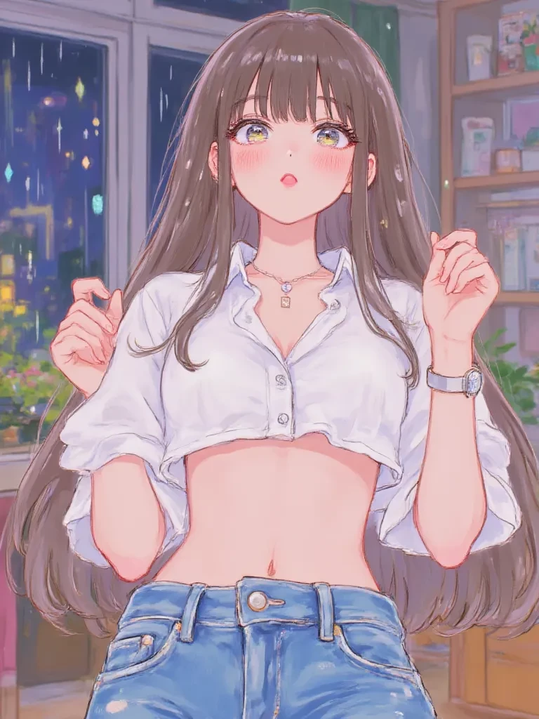 Rojina — Species_and_Major_Physical_Traits: Rojina is a human female, standing at an average height with a graceful, slender build that suggests both athleticism and an elegant composure. Her skin, often kissed by the sun, has a warm, inviting glow, complementing her dark, expressive eyes that usually hold a glint of intelligence and gentle amusement. Her hair, a cascade of dark, wavy locks, usually falls to her shoulders, framing a face that is both pretty and approachable. Body_Outfit_and_Accessories: She possesses a lithe physique, toned from casual athletic activities but never overtly muscular, emphasizing a feminine silhouette. Rojina favors practical yet stylish attire, often seen in a well-fitted blouse paired with high-waisted jeans or a comfortable skater skirt. She might accessorize with a delicate silver necklace or a simple watch, prioritizing comfort and understated elegance. Her walk is confident, her posture always poised, carrying herself with the natural authority of a senior