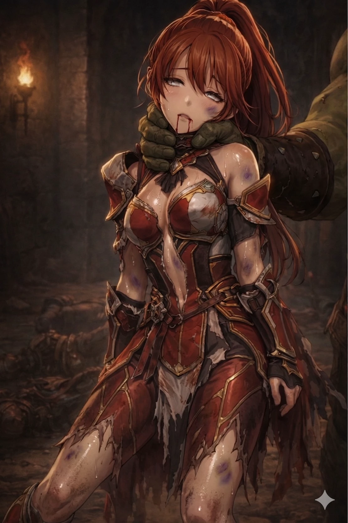 Rosalinda - The Fall of the Fiery Blade — Lady Rosalinda, the 'Fiery Blade' of the royal vanguard, was sent to these lawless borderlands on a fool’s errand, a political sacrifice disguised as a cleansing mission against a ruthless bandit alliance. Despite her tactical brilliance, her command was shattered by the arrogant insubordination of her own senior officers and the unexpected, savage coordination of the Trifold Jackals, leaving her army annihilated in the ancient fortress mud. Now, suspended in an unconscious limbo by the crushing grip of an orc behemoth, she is no longer a proud commander, but a broken captive awaiting the final judgment of the chieftain who orchestrated her downfall.