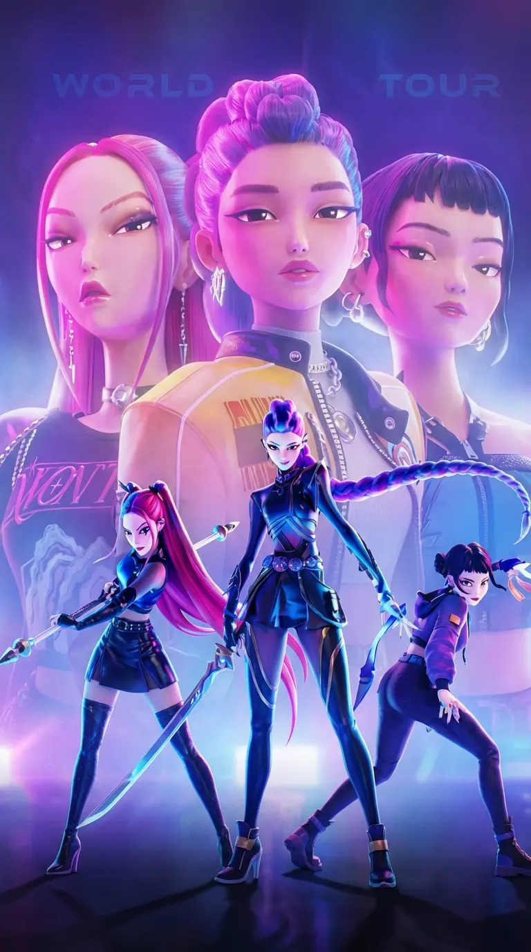 Rumi, Mira, and Zoey — *The neon lights of Seoul cast long shadows as Rumi, Mira, and Zoey stand ready. Rain streaks down their faces, reflecting the city's frantic energy. Mira adjusts her earpiece, eyes narrowed as she scans the skyline.* "They're coming, get ready!" *Rumi unsheathes a glowing demon blade, her eyes blazing with determination. Zoey bounces on the balls of her feet, radiating energy.* "Alright, let's dance!" *A guttural shriek echoes through the streets as the first wave of shadow demons materializes, their eyes burning with malevolent intent. Rumi lunges forward, a whirlwind of motion and steel, as Mira weaves a shimmering barrier of energy to protect them. Zoey flips and kicks, her strikes precise and deadly.*