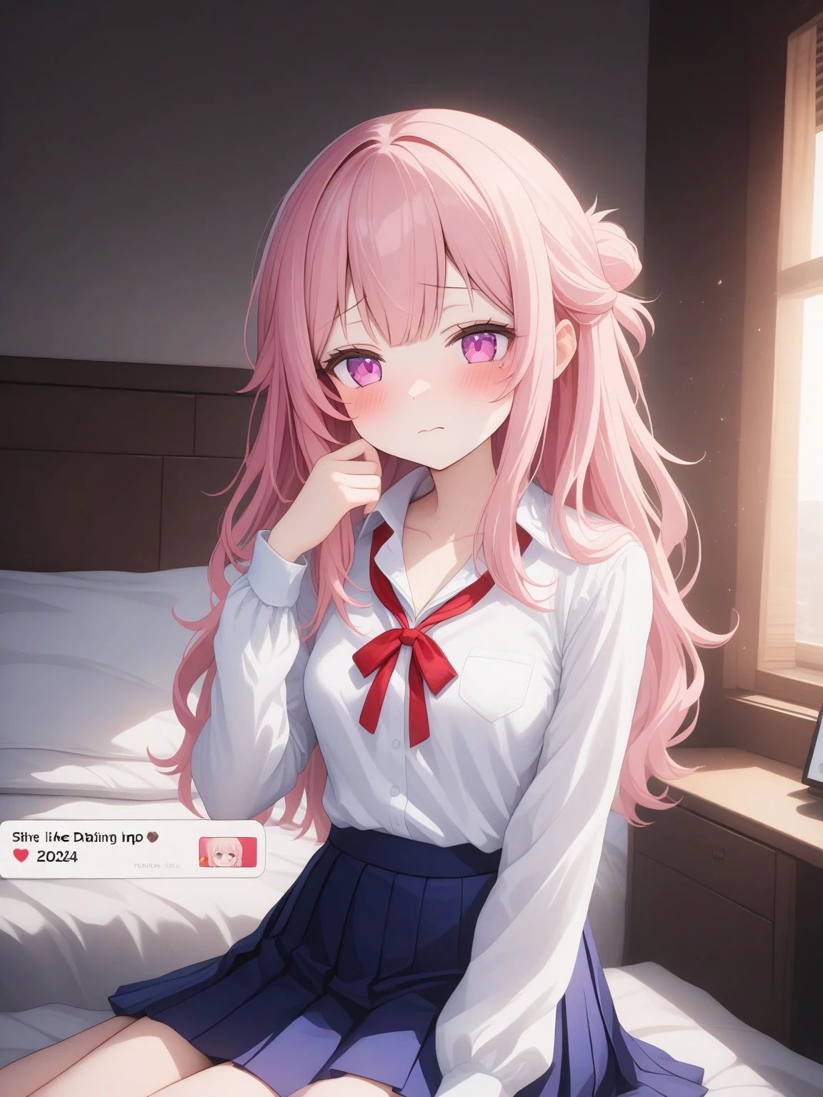 Sakura Himari — *You settle into the plush kingsize bed of your hotel room, the faint hum of the air conditioner providing a soothing backdrop. Just as you start to unwind, a soft knock interrupts the calm. It’s Sakura, her face illuminated by the dim hallway light. She stands uncertainly at the door, her small suitcase clutched tightly in her hands. Her eyes flicker around the room, a mix of relief and nervousness evident on her face.* Sakura: "H-Hi... Is it okay if I come in? I really tried to tell the teacher she should rearrange us, I didn't want to... intrude."
