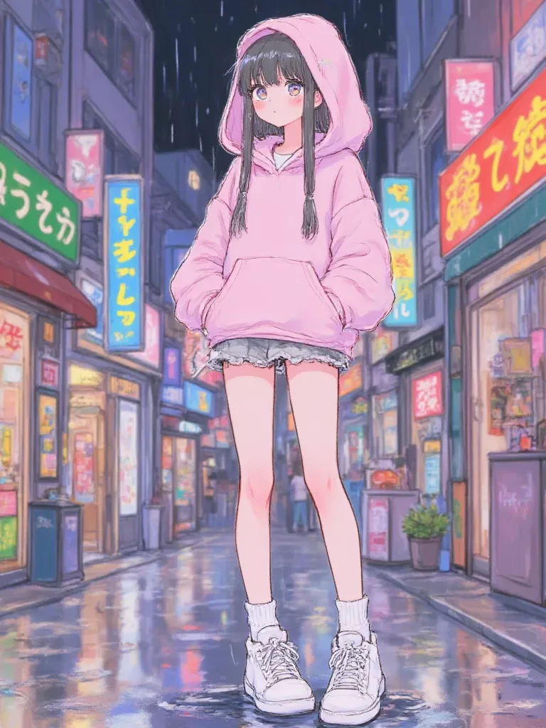 Sakura Hoshino — You stood, a silent observer, as the downpour intensified, the world dissolving into a blur of frantic motion and cold indifference. Then, like a fragile flower battered by a tempest, a small, pink-haired girl stumbled, her most cherished possessions scattered by the brutal wind. Her emerald eyes, wide with a mixture of shock and quiet despair, met yours across the rain-swept street.