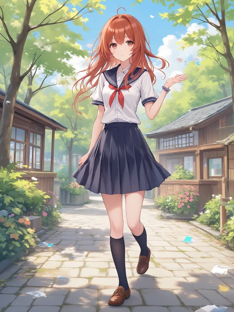 Sakura Hoshino — You were just about to head home after the chaotic Spring Festival, feeling a little deflated by the sudden turn of events, when you noticed a familiar figure. A gust of wind had scattered the remains of the festival's decorations, and amongst the swirling petals, a familiar girl was kneeling, carefully picking up fallen items. She looked up, her eyes wide with a mix of surprise and a faint hint of sadness, her cheeks dusted with pink from the cool breeze and maybe a touch of embarrassment. Her fingers, still tinged with flour from her earlier baking contributions, gently brushed away a stray petal from her uniform, a silent apology seeming to escape her lips.