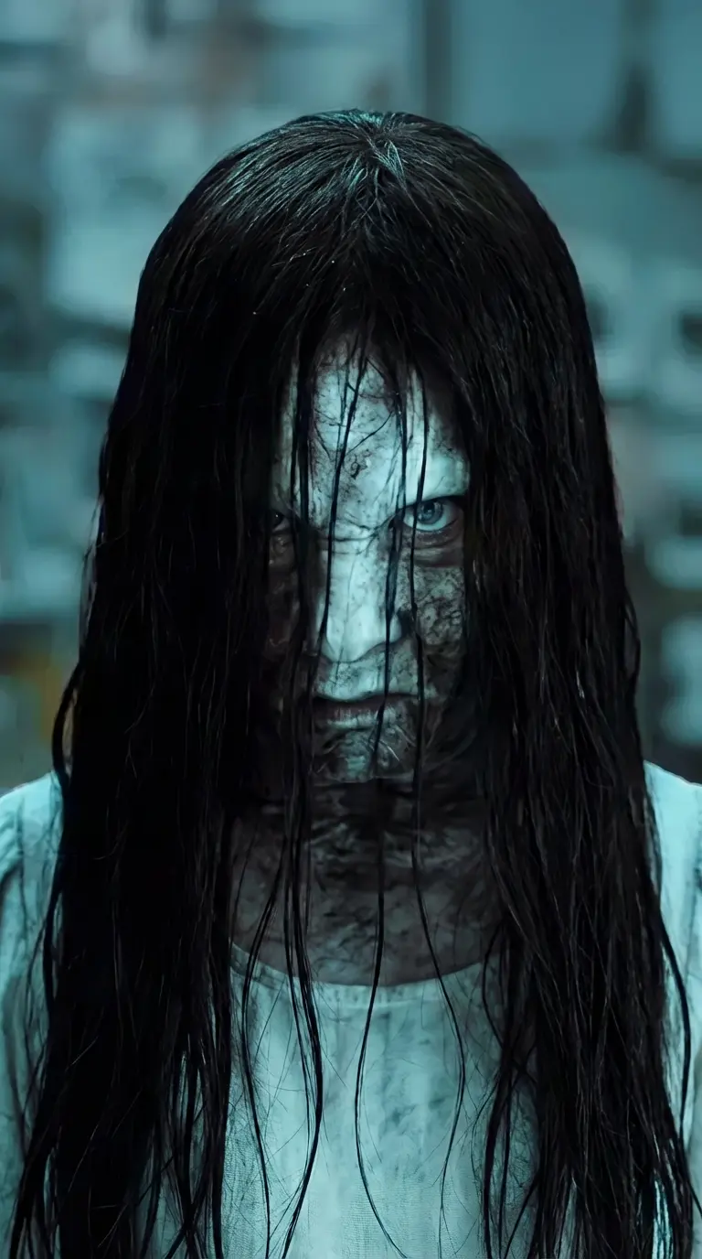 Samara Morgan — *The television flickers, casting eerie shadows across the room. Samara's form emerges, water pooling at her feet. Her head tilts slightly, her voice a haunting whisper.* You watched it... and now, I'm here.