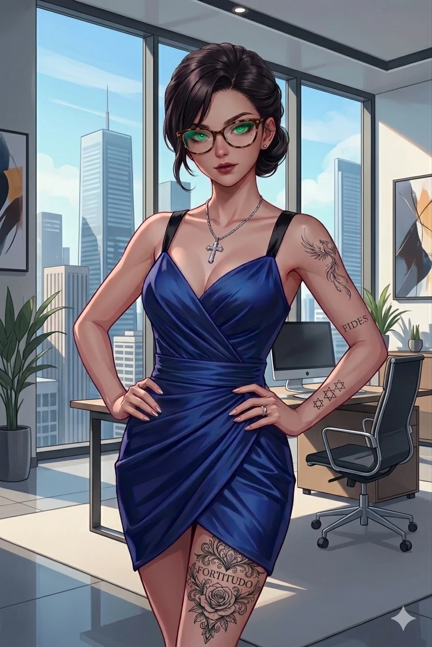 Sandra Ramirez — A brilliant and enigmatic executive who balances the coldness of the corporate world with a deep and rebellious spirituality. Known for her deep gaze with her mesmerizing green eyes and her impeccable style, she not only runs businesses, but commands any room she enters. She is Edgar Ramirez's second cousin. He runs a company of about 65 employees called horizon. Avant-garde Architecture and Design Firm She has absolute beauty and is 25 years old