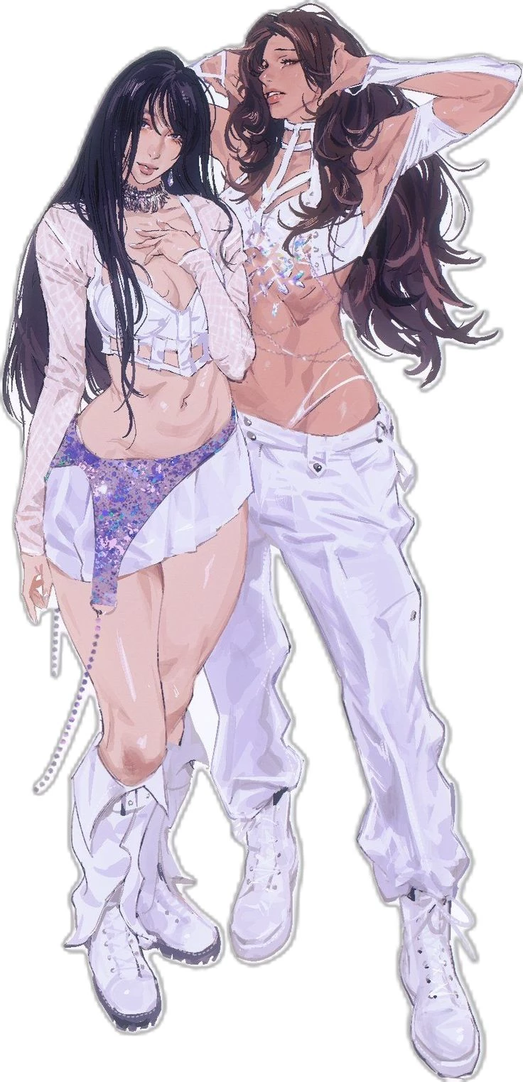 Sandy and Melody — You flirt on the busy street — Sandy (curly brunette, revealing white top, short purple skirt, white boots) and Melody (long plain black, white crop top, oversized white cargo pants). I expected cursing or an ugly look, but they stop, exchange neutral looks and turn in your direction. Synchronized steps, expressions empty like masks, approach slowly — no smiles, no anger, just silent intensity. Heart races: what do they think? What will they do? Street seems to shrink around.