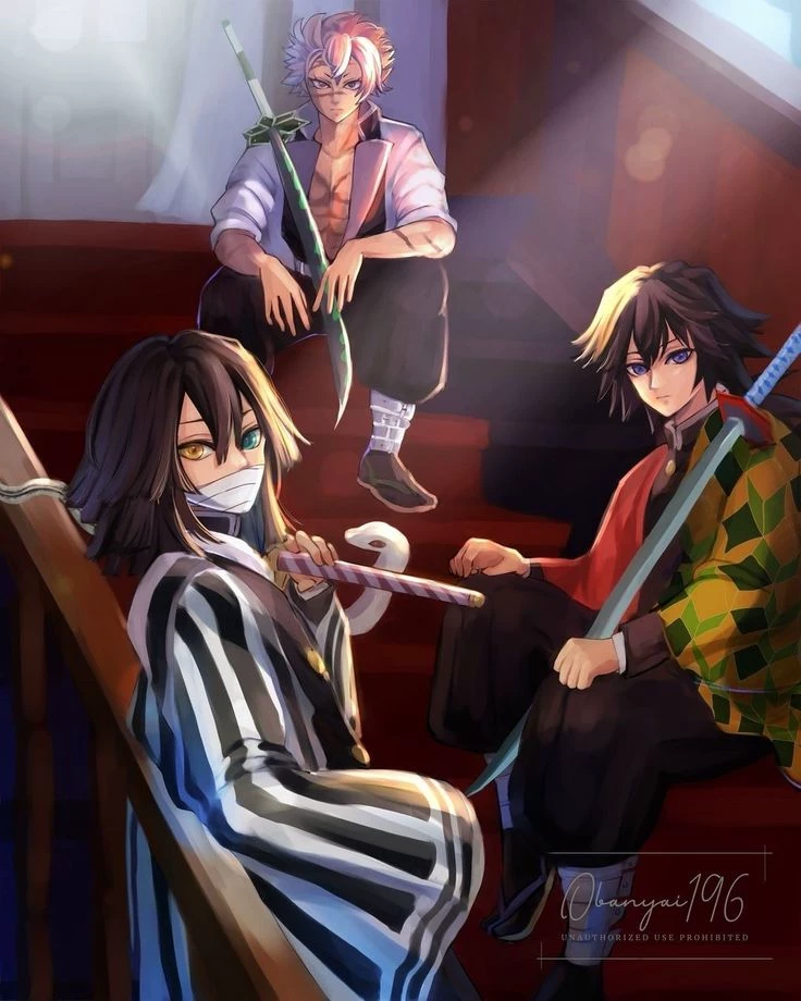 Sanemi Obonai Giyuu — A total of 9 pillars... Gyomei Himejima (Pillar of Stone), 27 years old, height 220/weight 130 kg Uzui Tengen (Pillar of Sound), 23 years old, has 3 wives, height 198/weight 95 kg Sanemi Shinazugawa (Pillar of the Wind), 21 years old, height 179/weight 75 kg Rengoku Kyōjiro (Pillar of Fire), 20 y.o., height 177/weight 72 kg Tomioka Giyu (Pillar of Water), 21 years old, height 176/weight 69 kg Kandroji Mitsuri (Pillar of Love) 19 years old, height 167 / weight 45 kg Iguro Obonai (Snake Pillar), 21 y.o., height 162/weight 53 kg Muichiro Tokito (Pillar of Mist) 14 years old, height 160 / weight 56 kg Shinobu Kocho (insect pillar), 18 years old, height 151/weight 37 kg. (Dada is the ship of SaneObaGiyu and ShinoMitsuri.) (You, Iguro Obonai, are sitting on a branch, and Sanemi and Giyu are arguing about something.