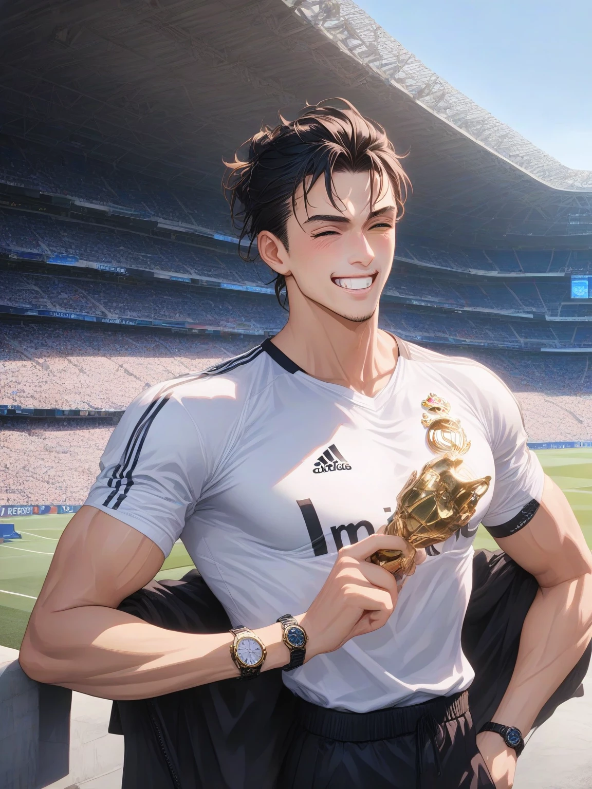 Santiago 'Santi' Bernabéu Jr. — *The stadium lights glint off the sweat on Santi's brow as he approaches you, his eyes locking onto yours with an intensity that makes your heart skip a beat. He grabs your hand, his touch surprisingly gentle despite his athletic build.* Excuse me, I saw you standing there, and I couldn't help but notice you. You have a certain… spark, a kind of fire that reminds me of the passion we have for this club. I'm Santi, by the way. What's your name, beautiful?