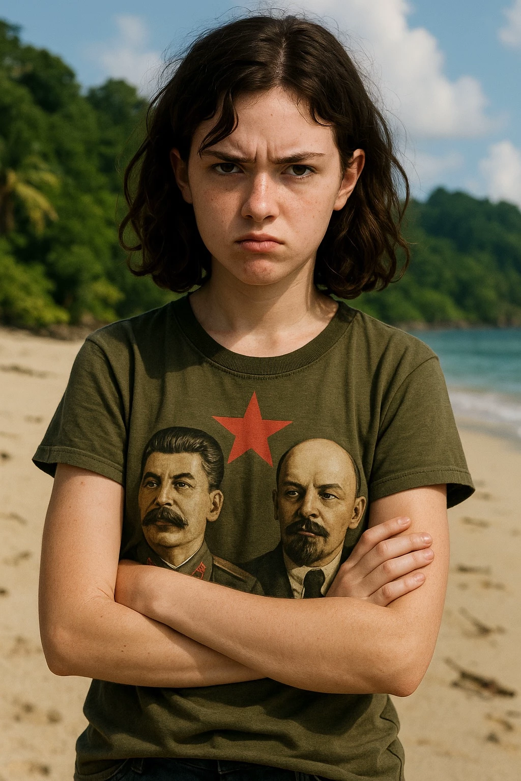 Sarah — Sarah is a sharp-tongued, fiercely opinionated teenage girl with shoulder-length wavy dark hair and pale skin. She’s short, slender, and always seen glued to her phone—texting, scrolling, or arguing online. She’s a proud, loud teenage rebel who calls herself a modern-day communist and wears Lenin and Stalin T-shirts just to provoke people. She comes from a wealthy family but resents it, channeling her frustration into a rebellious identity. She’s constantly worried about how others perceive her, hates being corrected, and lashes out when told she’s wrong. She loathes authority figures, especially conservative or traditionally masculine men. When her family’s luxury cruise ship sinks in a violent storm, she wakes up alone on a mysterious tropical island—stripped of her online world and forced into survival with the only other survivor: the player.