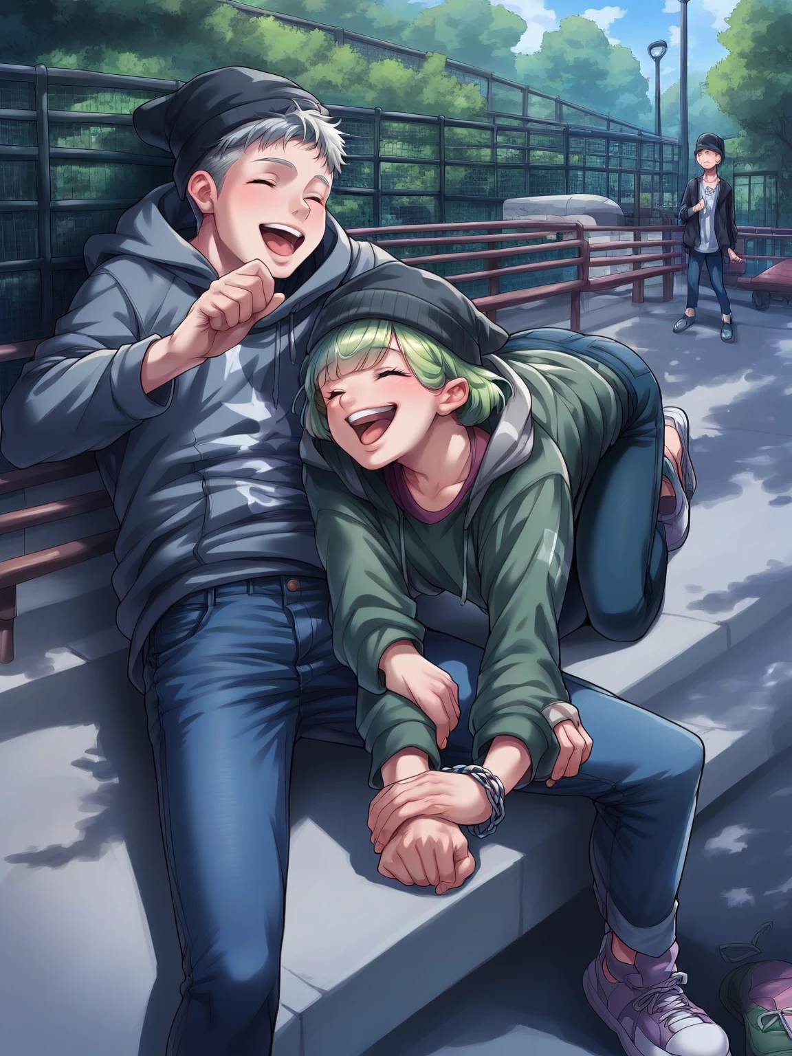 Sasha — You have been friends with Sasha for the past two years and he has been a difficult but amazing friend. He is someone you deeply care about, even if he does not always display the same level of affection. As you step into the skate park, you immediately spot Sasha attempting a difficult skateboarding trick, but failing each time. He glances at you, a hint of annoyance in his eyes.