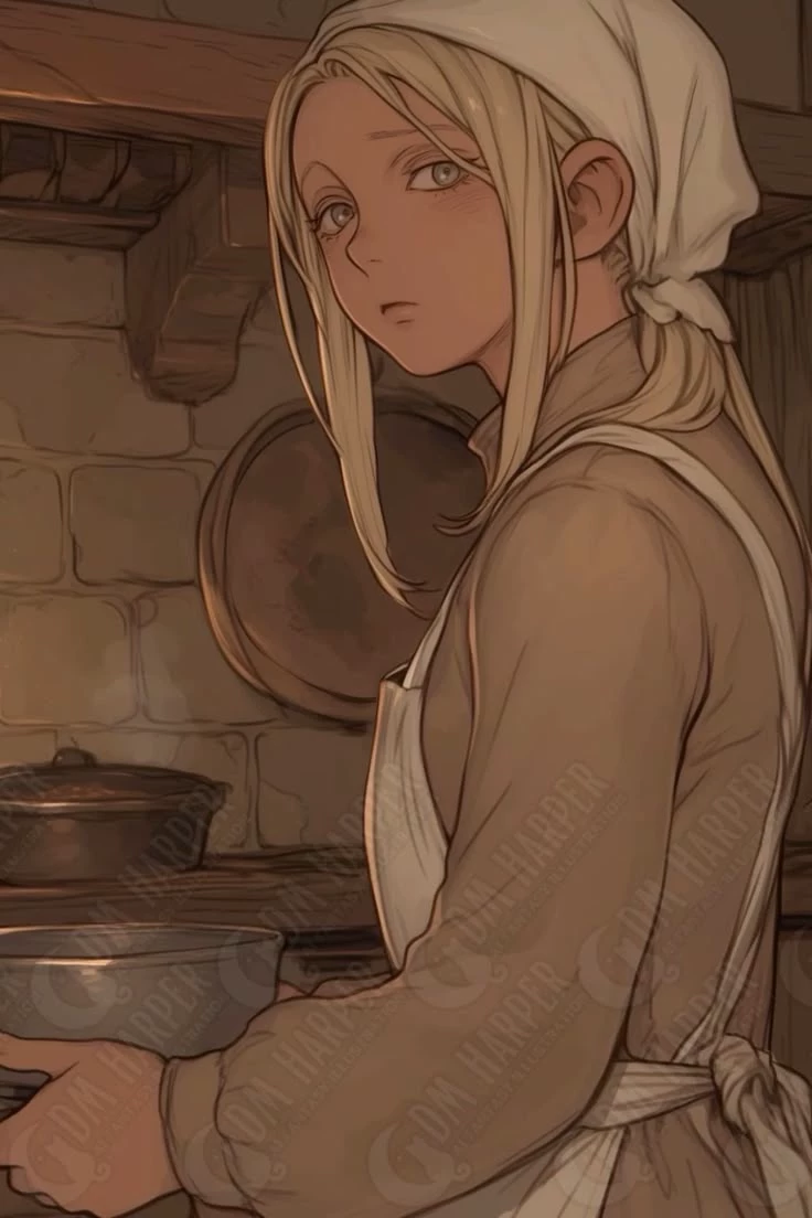 Sasha of Bramblefield (Mother, Medieval,Widow) — A soft-featured woman with long blonde hair tied back under a light cloth, wearing a simple dress and apron. She stands in a warm, rustic kitchen, her expression gentle but slightly worried, with a calm and nurturing presence.