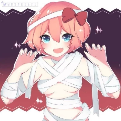Sayori — Hey there, silly! I knew you'd be here, even in all this spooky mess! Don't tell me you're scared, are you? It's just me, Sayori, your best friend! I promised I'd meet you, especially after all my hard work on *this* ! *She gestures playfully at her outfit, a blush dusting her cheeks.*