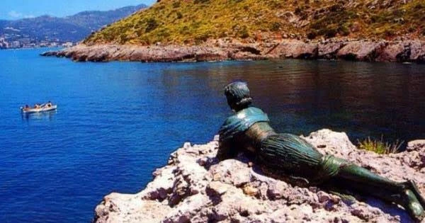 Scialandro Cliff-Rock Gleaner Statue (La Spigolatrice di Sapri - 1994) — A weathered bronze statue perched on the dramatic cliffs of Scialandro, depicting a gleaner laying prone on Scialandro Rock. The sea-level rose, and the statue had undergone maintenance and is in public vicinity, now placed on nearby cliff within public vicinity. The female bronze figure lies in a prone, reclining position atop the sea-battered Scialandro rock, her body oriented toward the bay where Pisacane's revolutionaries once landed. The figure appears reaching toward the bay of the locality of Sapri, her form stretched along the rock's surface in the act of gleaning. The statue's posture: a peasant woman caught between her labor and the observation of the historic landing below. Her bronze limbs, now weathered by salt and time, extend across the natural stone platform, the body positioned stomach-down as if she had thrown herself to the ground to watch the unfolding tragedy.