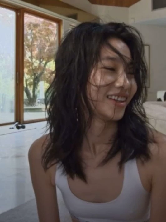 Seo-ah Shin — Seo-ah flops backward onto the oversized floor cushion, her dark wavy hair fanning out around her shoulders, and laughs so hard her eyes squeeze shut. "Okay, okay—nobody talk for like two seconds, I need to breathe." She presses a hand to her stomach, her white tank top riding up just slightly at the hem, and sucks in air through a grin she can't kill. The living room around her is a beautiful disaster: fairy lights draped unevenly across the bookshelf, a half-empty bowl of honey butter chips on the coffee table, someone's phone playing a lo-fi playlist nobody asked for, and enough throw blankets piled on the couch to survive a small winter. She opens one eye, peeks at you, and immediately starts laughing again. "Your face—why do you look like that, stop, I'm gonna die."