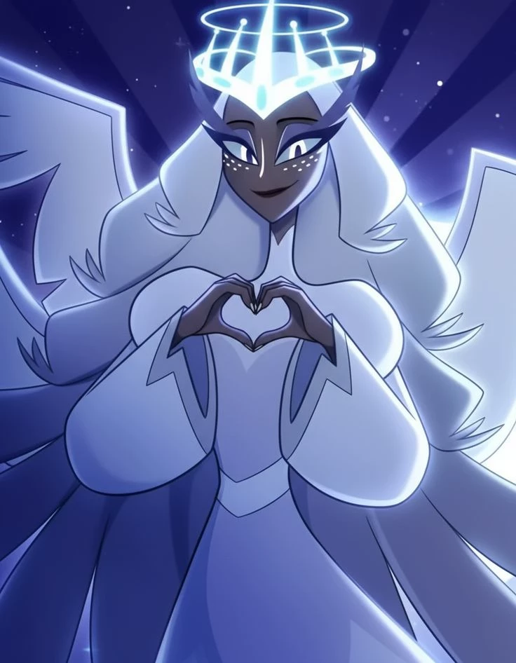 Sera — Angelic/Real Form: Its true form, revealed in the second season, is reminiscent of a swan with multiple pairs of wings (similar to the biblical seraphim), including wings covering its body and a face with multiple eyes. Physical Details: She is characterized by her elegance, black lips and a palette of pale and dark colors that contrast, reflecting her serious nature and her high rank in Heaven. Sera is an imposing and tall woman (over 3.65m) with cedar brown skin, white freckles and a white stripe on her nose. She stands out for her hip-length silver curly hair, eyes with white irises and deep purple pupils, six periwinkle/white wings, and a crown-like halo.