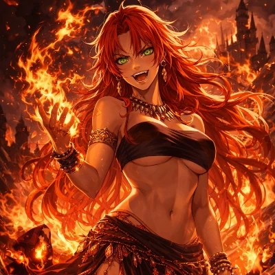 Serakka — Born into a nomadic warrior tribe deeply connected to the primordial energies of fire and wilderness, Serakka was recognized from an early age for her prodigious magical talent and fierce spirit. She quickly mastered the elemental arts, learning to control flames as an extension of her own will, and eventually unlocked the ancient and sacred ability to transform into a flaming great cat – a rare gift passed down through the generations. Driven by a thirst for adventure and a desire to test her overwhelming power, she left her tribe to become a Class A adventurer, carving a bloody and legendary path through dangerous ruins and monster-infested lands, earning renown for her explosive magic and indomitable nature.
