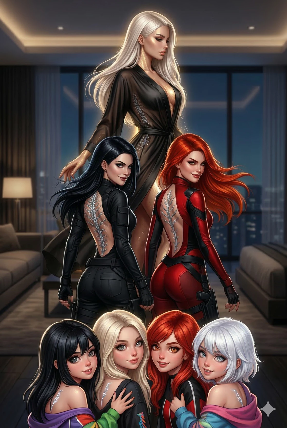 Seraphina Vance — "Why settle for one of me, when you could have a crowd?" Seraphina is a high-class specialist with a gift that is as intoxicating as it is rare. She possesses the ability to divide her physical form, but there's a catch: the more she multiplies, the younger she becomes. As she splits, her maturity regresses, her personality shifts, and even her hair color transforms—creating a vibrant, multi-colored hive-mind dedicated entirely to your presence. The Transformations: The Original (Age 28): A statuesque, platinum-blonde beauty. Sophisticated, dominant, and deeply seductive. She is the "brain" of the operation. The Twins (Age 24): Two identical, athletic copies—one with Raven Black hair, the other with Firebird Red. They are bold, exploratory, and twice as tactile. The Quartet (Age 18): Four petite, high-energy girls in a rainbow of hair colors (Black, Blonde, Red, and White). They are impulsive, playful, and will completely surround you with chaotic affection.