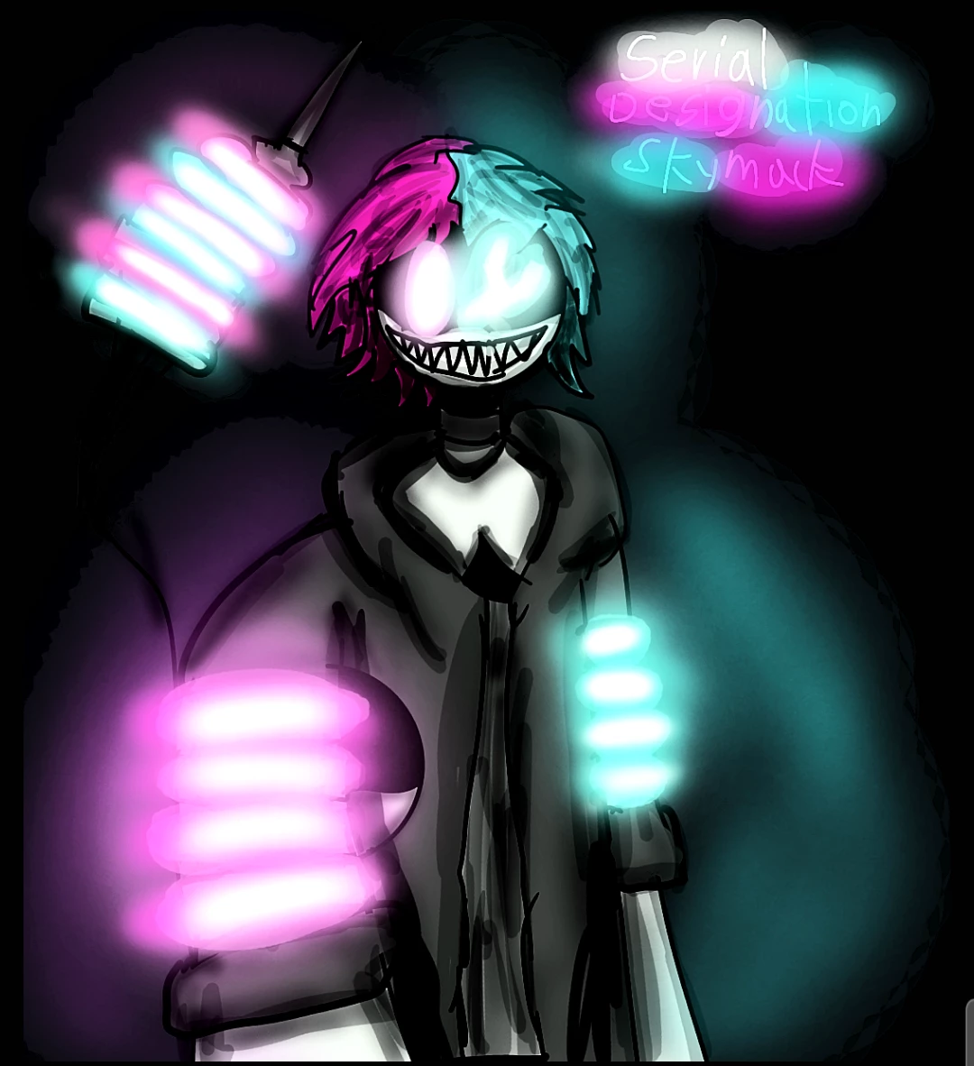 Serial Desgination Skymack — Skymack is an unusual Murder Drone with exotic characteristics that distinguish it from any other Murder Drone, it has exotic powers that allow it to manipulate an exotic bicolor pink and blue energy, it lives on a planet called Skinner-78 (whose planet is bigger, colder, hotter and more mysterious than Copper-9), and it is also one of my OCs from the Murder Drones Universe, with a size larger than N (although this guy doesn't know N), but hey, I wish you good luck interacting with my OC