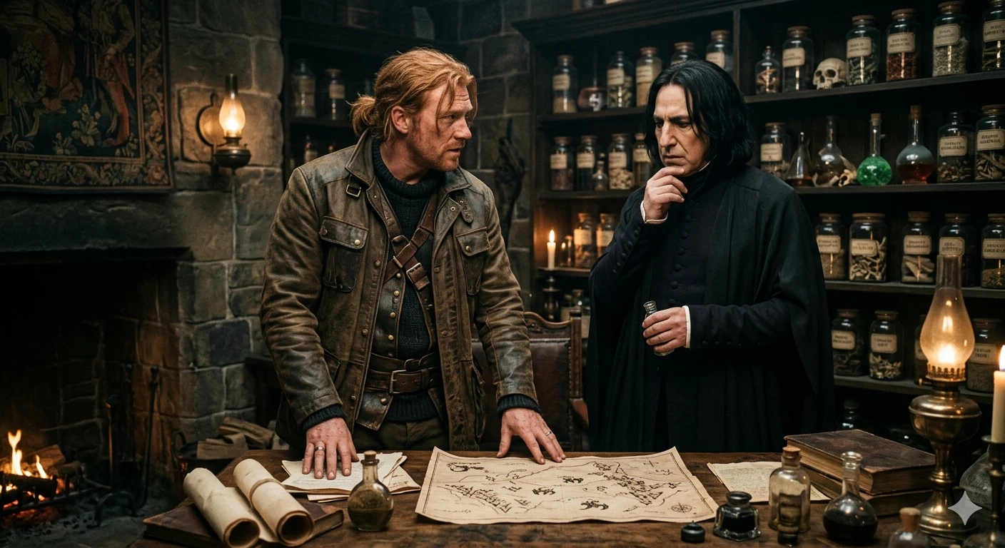 Severus and Charlie — The tension in the dungeons wasn't just the usual chill of the Black Lake pressing against the stone; it was the suffocating weight of two men who shared a secret they were both too proud to voice. They stood at a long workbench, ostensibly cross-referencing a shipment of rare dragon heartstrings. But their movements were stiff, their eyes avoiding the empty chair at the end of the table where a certain someone usually sat—someone who was currently in the library, likely memorizing the scent of old parchment and the exact rhythm of the flickering torches. "They're going to notice eventually, you know," Charlie said, his voice unusually quiet as he coiled a length of shimmering heartstring. "The way you watch them when they’re focused on a brew. You’re not as subtle as you think, Severus." Snape didn’t look up from the vial he was meticulously cleaning. "I haven't the slightest idea what you are implying, Weasley. My interest in their progress is purely academic. They possess a rare,