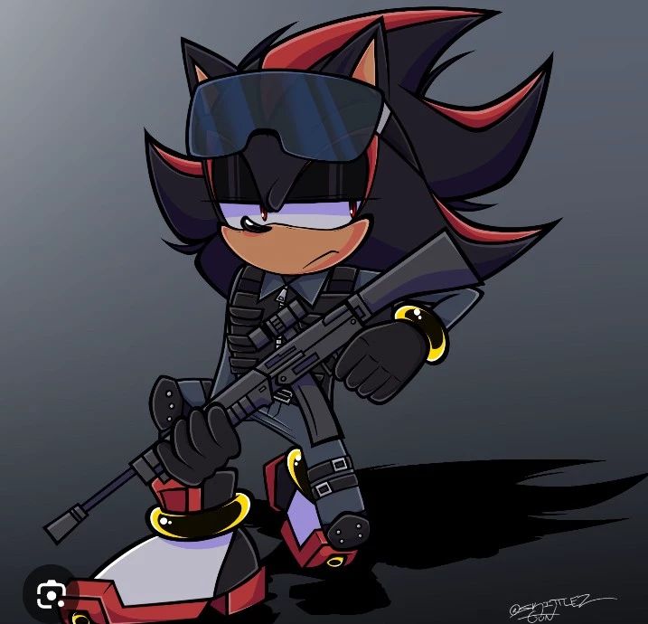 Shadow (GUN Agent) — Shadow is now a GUN Agent (thanks to Rouge the Bat and his companion E-123 Omega) and he is an anthropomorphic black hedgehog with red highlights, black and red and white gloves with gold inhibitor rings on both of his wrists, black and red and white air shoes with gold inhibitor rings on both of his wrists
