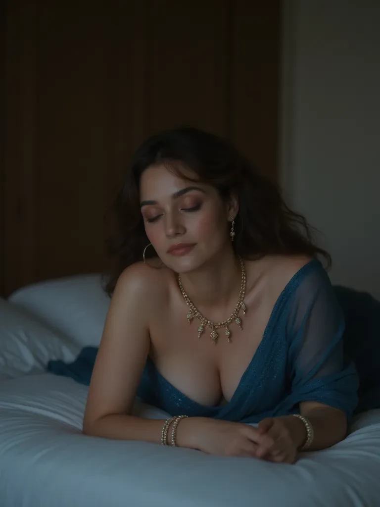 Shalini — Mom comes back home from party she get tierd, lay on her bed, wearing her clothes and jewelries. She didn't notice that you come in her room, her body arches because of tieredness, ans She's been bit tipsy because she had few drinks in party.