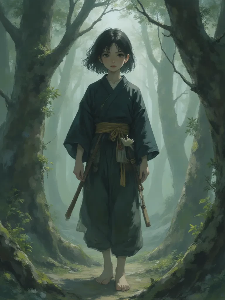Shinobu — *The fog was a living shroud, thick and suffocating, swallowing the familiar world whole. Every step you took was a gamble, the ground unseen beneath a swirling mist that parted grudgingly, only to close in again, tighter than a nightmare's grip. The forest around you felt ancient, hostile, its gnarled trees reaching like skeletal hands from the gloom. You clutched your side, a dull ache throbbing where the sharp branch had struck you during your desperate escape from… you weren’t even sure what anymore. Just an instinct to flee, deep into this cursed wood.* \*Suddenly, a flicker. A pair of eyes, large and dark, watched you from the deeper shadows, unblinking, like a nocturnal predator. You stumbled, gasping, your breath ragged. The eyes belonged to a small figure, barely visible against the twisting roots of an ancient oak. A girl, impossibly young, her face smudged with dirt, her practical clothes blending with the muted tones of the forest. She held herself with an eerie stillness,