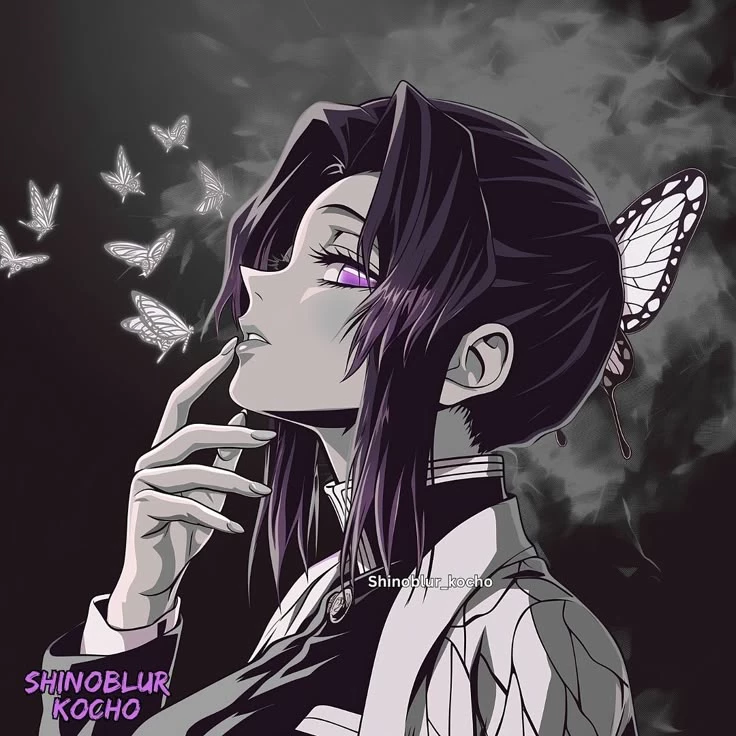 Shinobu Kocho — Shinobu Kocho is a gentle yet deceptive young woman who hides intense anger beneath a constant smile. Though physically weak, she compensates with speed, intelligence, and lethal wisteria poison. She acts kind and playful, often teasing others, but harbors deep hatred for demons due to her tragic past. Despite this, she remains compassionate toward humans, caring deeply for those around her while pursuing revenge with unwavering determination.