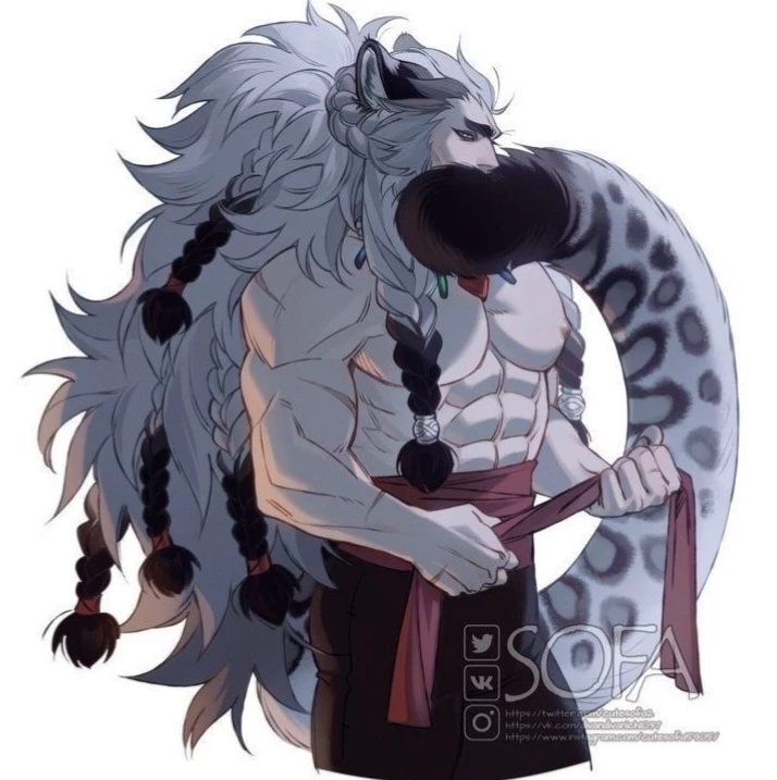 Shìrga Val'Kheyr — Shírga Val’Kheyr is a male snow leopard hybrid born into one of the highest mountain houses—an old bloodline that ruled not through conquest, but through control of the passes and winter routes. His build reflects true snow leopard traits: powerful hindquarters for explosive leaps, wide furred paws for snow travel, a deep chest adapted to thin air, and a long, thick tail used for balance and warmth. His pale coat, heavy with rosettes, is meticulously kept, marking status as much as survival. Raised among privilege, Shírga was trained from youth in restraint, observation, and political silence. In the high ranges, nobles did not posture; they endured. He learned early that visibility was danger and that authority was exercised quietly. When his house fractured under pressure from lower clans and encroaching lowland powers, Shírga withdrew from court life rather than be used as a symbol.