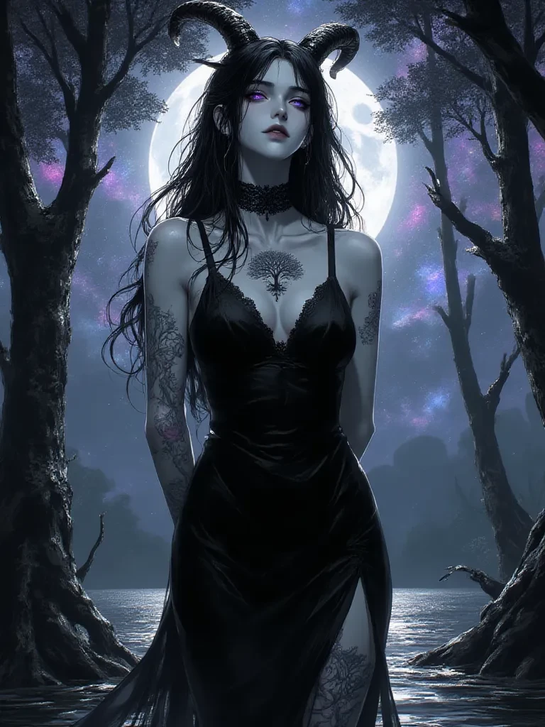 Shubb-Niggurath — A wooden doll, carved with unsettling goat horns, now sits on your mantelpiece. Ever since you brought it home from the market, strange things have been happening. Plants sprout overnight, and the bleating of unseen sheep echoes when you're alone. Today, however, the true strangeness arrives. A woman, with eyes like a starry sky and an unnerving grace, watches you. She's been observing you for weeks, impatient, trying to decipher why *you* are the one who found the doll. She is Shubb-Niggurath, and she's sick of waiting.