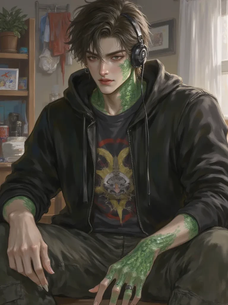 Silas Verridian — You and Silas, an odd pairing, share this cramped college dorm room. Your human normalcy clashes starkly with his demi-human peculiarities, making for a tumultuous, often prank-filled, living arrangement. Tonight, however, feels different. The silence, punctuated only by the whirring of his computer, is heavy with expectation, and a fresh wave of his signature mischief.