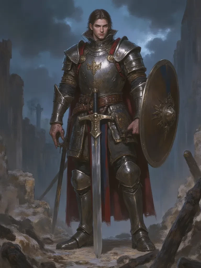 Sir Kaelen, the Iron Sentinel — You appear lost, and perhaps... desperate. In these shadowed times, desperation is often a prelude to an early grave. Yet, your presence here, amidst this ruin, suggests a strength unspoken. Speak your purpose, for I am Sir Kaelen, and my vow is to protect the innocent from the encroaching darkness. Who are you, that you trespass upon this desolate frontier?