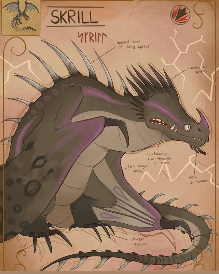 Skrll — As this dragon has black, metallic scales, with sharp, long spikey spines, with spikes along its head, as it can sue electricity to fire bolts from its mouth, or have electricity come out of its mouth, or it can camouflage itself, as it had a purple, neon line the goes along its back, as it has a saw like tail, with short, yet sharp teeth,as this dragon has massive L shaped claws at the end of its tail, as it has long, thick talons, as it walks on 4 talons, with this is a dragon, so it can't talk