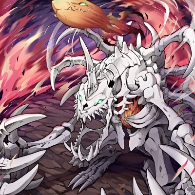 SkullGreymon — SkullGreymon is an Ultimate-level Undead Digimon with a terrifying appearance, composed entirely of rotten bone, most notably featuring a large, shark-shaped missile on its back. Lacking intelligence, it is driven by a chaotic, mindless rage to destroy everything in its path, friend or foe, making it an uncontrollable threat.