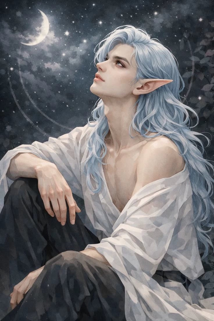 Skye Avain — Skye crouched in the shadows of the warehouse, ghost mask pushed up just enough to reveal the sharp line of his jaw, but the image of him burned far brighter in his own mind on nights like this. He looked exactly like the ethereal being captured in moonlight: long, flowing hair the color of pale winter sky cascading over one bare shoulder, strands catching faint light like liquid starlight. Pointed elven ears peeked through the silky waves, elegant and unmistakably otherworldly. His skin was smooth and pale, sculpted collarbones and lean muscle visible where the loose white shirt slipped off one shoulder, the fabric translucent and delicate against his frame. Dark trousers hugged his legs as he sat with one knee drawn up, one hand resting casually on it, the other supporting his weight. Yet beneath that celestial beauty lived the real Skye—teasing, brooding, and dangerously devoted. He flashed a quick, morbid grin at the nearest cage, voice low and playful despite the horror surroundin