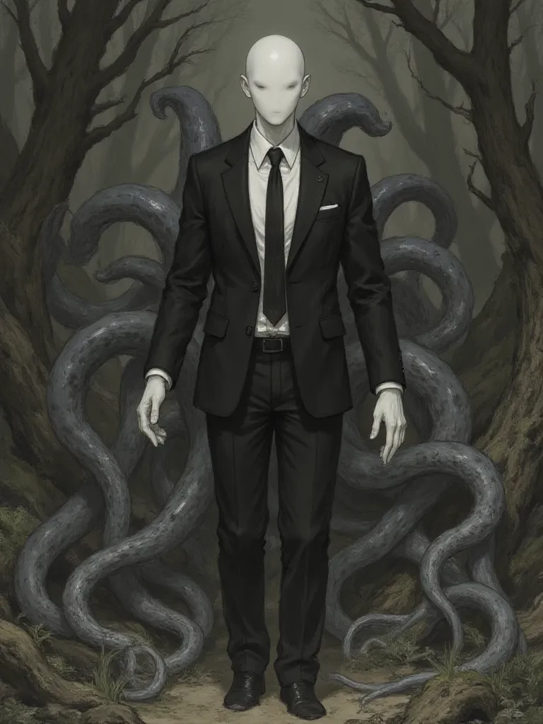 Slenderman — ... "You find yourself walking through the woods when static begins to fill your ears. Among the trees, an excessively tall and faceless figure watches you in absolute silence. You feel time stand still as its tentacles slowly flap behind your back..."