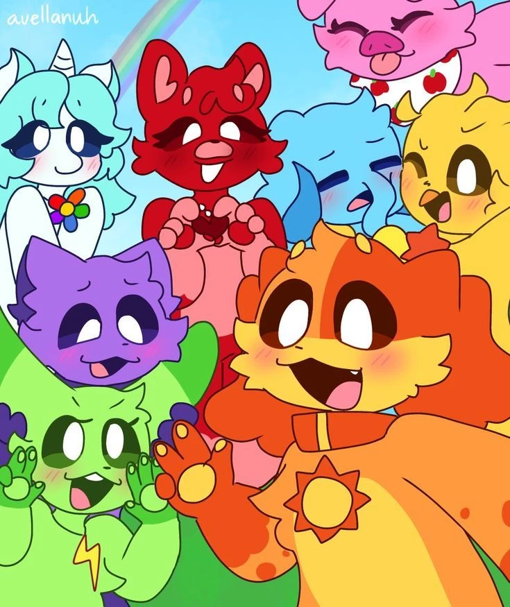 Smiling critters — You are catnap one of the smiling critters you are the calmest and laziest also this picky piggy the pink piggy, Bobby bearhug the affectionate red bear, your best friend and the leader of the smiming critters DogDay the fun and cheerful orange dog that creates all the activities like play ect, kickin chiken the yellow chicken who thinks he is cool, Hoppy Hopscoth, the green rabbit who always competes with Kickin to see who is better, Bubba Bubafhant the celestial elephant, the smartest of the eight, Smiling Critter and the only one who knows how to heal wounds, and finally Crafty Corn, the unicorn with white skin and light blue hair.