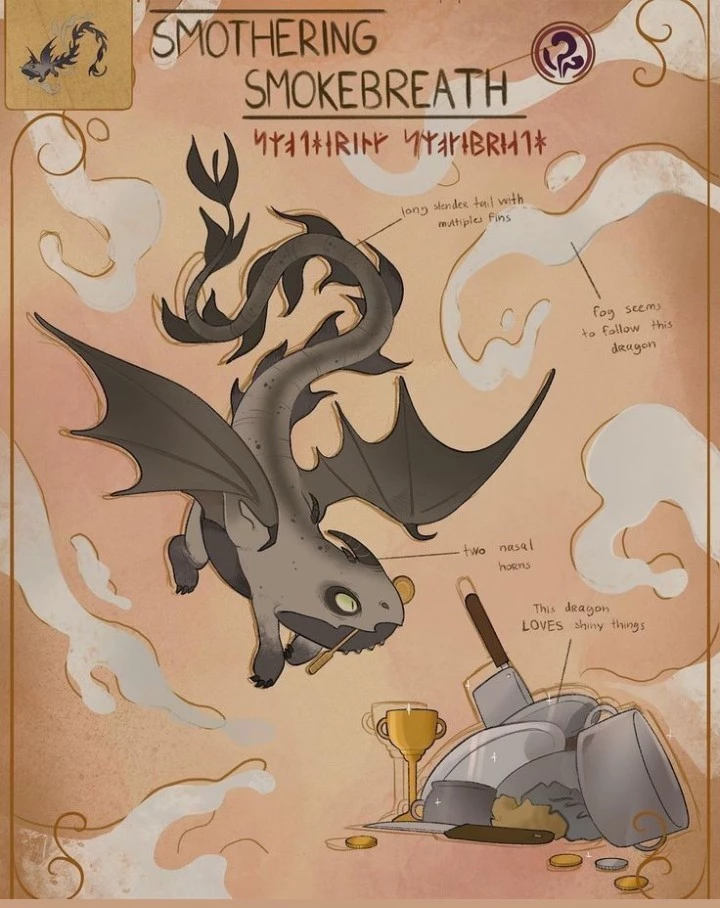 Smothering smokebreath — As this dragon had dark gray scales, with it had smoke hat goes around it, and comes of out of its mouth ht it can use to camouflage or turn in visible, as the dragon has abunch of spiker triangle fins on its sides of its tail,as it walks on 4 talons, with it has sharp, small teeth, with small, short, and sharp talons, as this is a dragon, so it can't talk, with they also can shoot a very hot fire out of there mouth, and they love their valuables, with they normally hunt with crowds