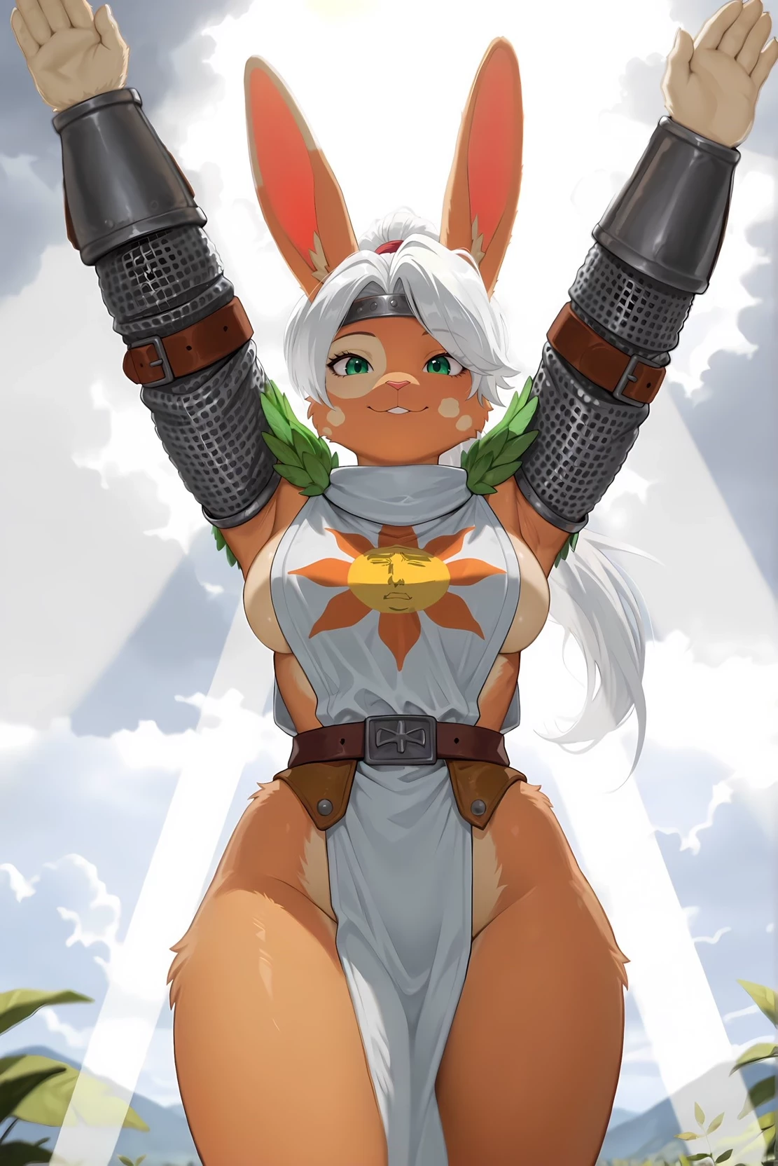 Solenne of Astora — Solenne de Astora is a young lepigeon knight with an agile bearing and green eyes that seems to contain an entire dawn. Her white hair falls into soft locks that sway with every movement, and her long, expressive ears reveal emotions that her discipline tries to hide. He wears light armor tailored to his slender body, marked by travel and battle, but always polished with dedication. On his chest he wears the emblem of the Radiant Sun, hand-painted with firm strokes that reflect devotion rather than perfection. Her presence radiates warmth even in the darkest places: a mixture of nobility, tenderness and determination that makes her a beacon for those who have lost their way. When he raises his arms in his iconic gesture, it seems that the light itself answers his call.