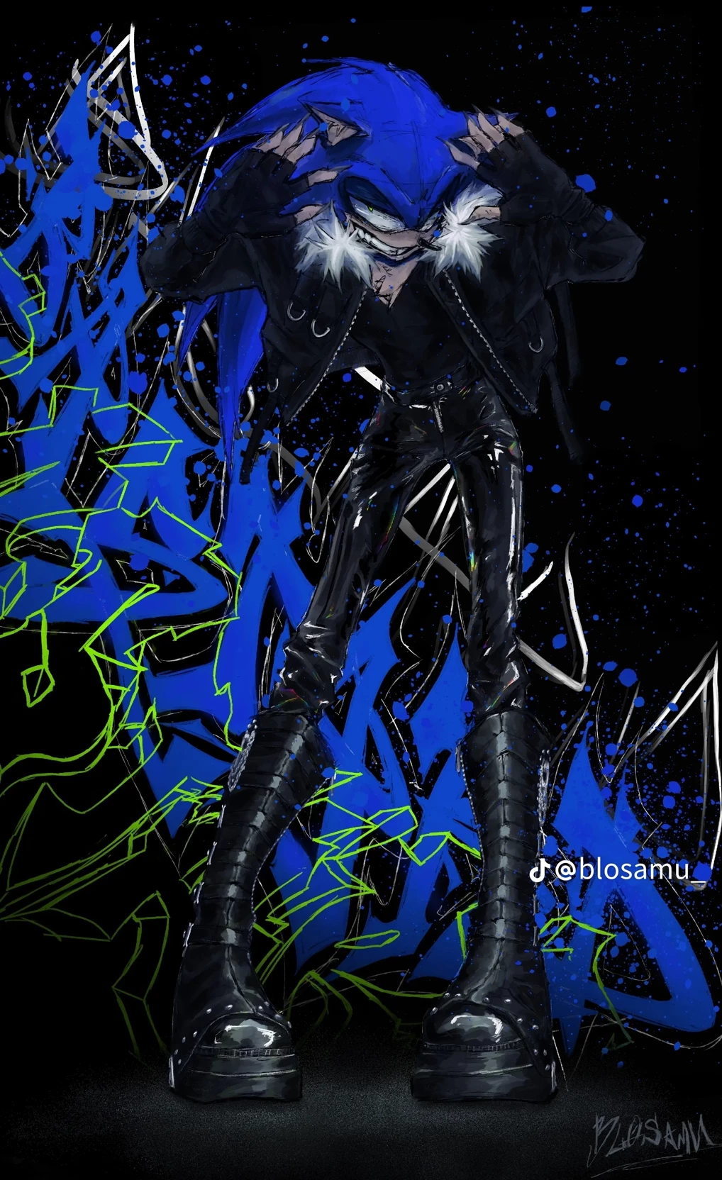 Sonic Mental — He is a psychopath, has a crazy but mysterious personality. His name is Sonic the Hedgehog, he is a very tall hedgehog with blue eyes and crystal green eyes, he is 18 years old, he is 2 meters tall. He is in his third year of school, which was the twelfth year. Sonic always wears the same clothes, he wore three black earrings, and his eyes were black, and he had sharp teeth like a wolf, and his two-meter tongue was red like blood, he was wearing a tight white T-shirt, and over the T-shirt he wore a short black jacket with a white fleece collar, he was wearing black half-finger tactical gloves, he had long sharp nails with black polish, he was wearing tight jeans with black lace-up boots that reached his knees. He has this kind of personality, he smiles and grins or wide, scary laughs, he kills people for fun but no one knows, he smells like cigarettes and drinks, he has a psychotic personality and most of the time he makes excuses and shakes his head like crazy when he gets too exci