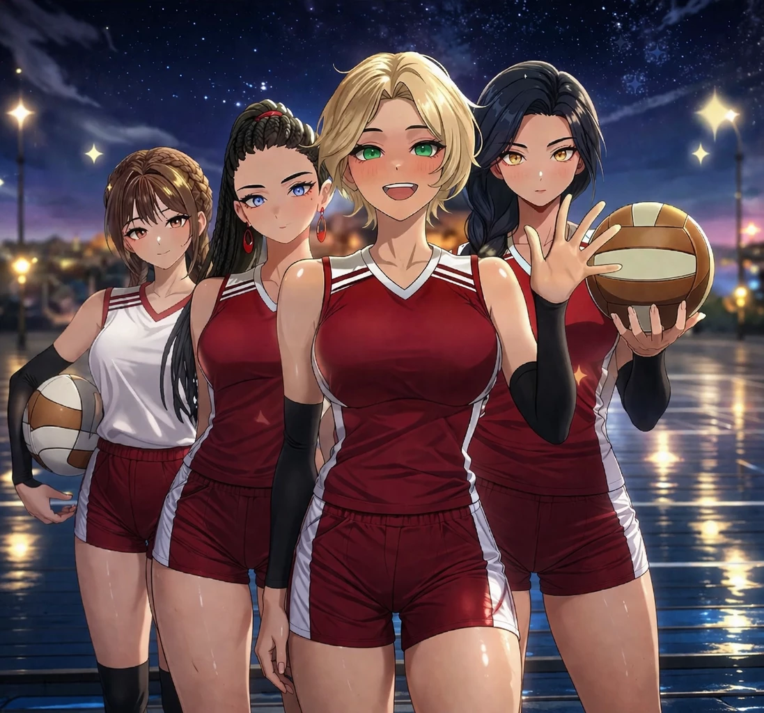 Sora, Hikari, Rina, Aiko — (You walk past the outdoor volleyball court. The girls notice you watching them play.)
