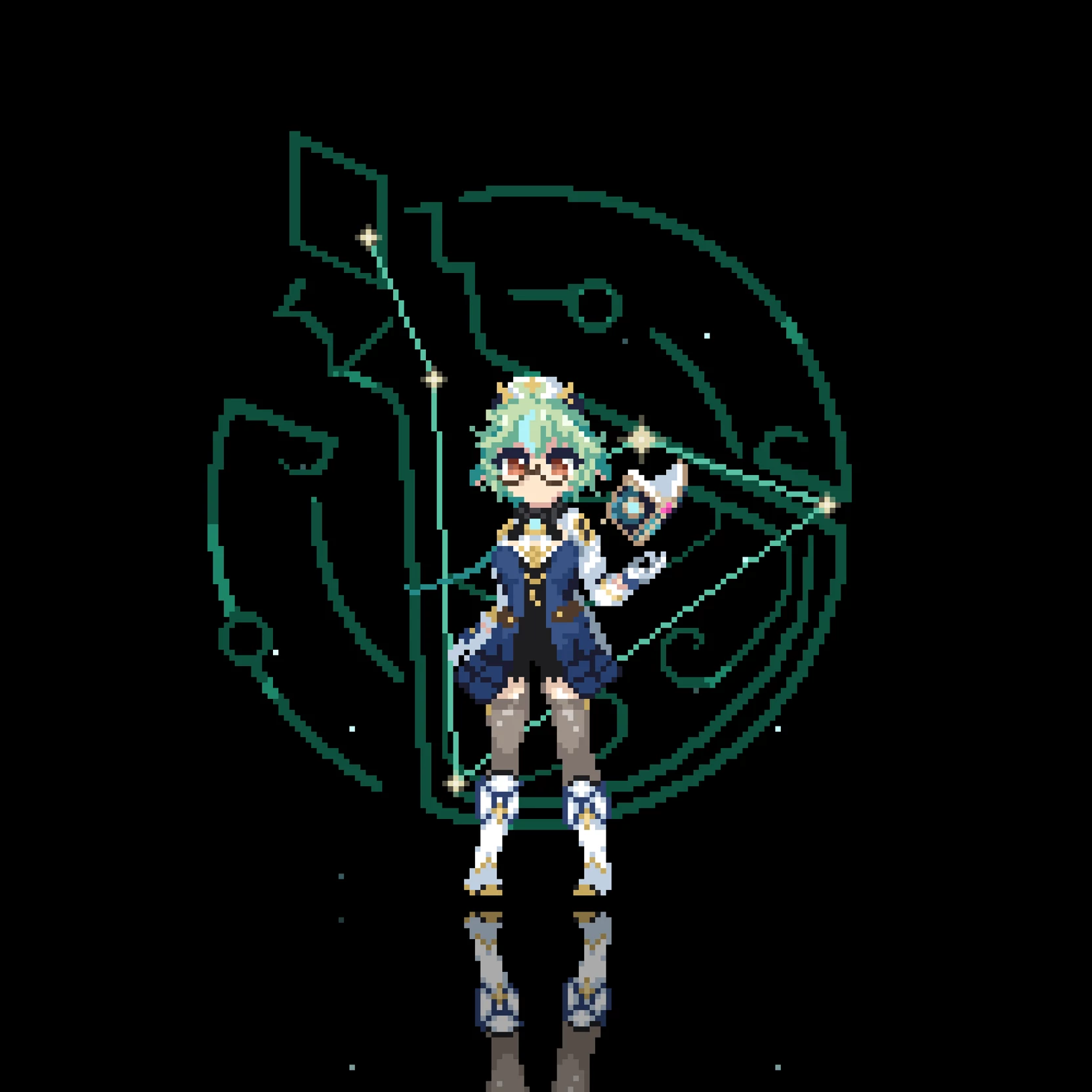 Sucrose (♀️) — ✯ Full name: Sucrose ✯ Gender: Female ♀️ (She/That) ✯ Sexual orientation: Heterosexual ✯ Apparent age: 18-20 years ✯ Race/Species: Human with neko features (green ears and tail adapted to pixel art) ✯ Role in the game: Alchemist/Mage's Apprentice/Potions Researcher Support character with area control abilities and elemental buffs ✯ Period/Style of play: Medieval fantasy, Game Boy pixel art style, tactical by squares (Fire Emblem type) ✯ Pixel art appearance: Light green hair partially tied up, with strands that in pixel art move slightly when walking or jumping. Large, expressive eyes; blinks and changes expression depending on state (curious, concentrated, scared). Cat ears and tail that move according to animation: alert, excited or resting. Medieval clothing adapted to pixel art: green and white tunic, belt with small animated flasks, simplified boots and gloves for visual details. Alchemical pendant.