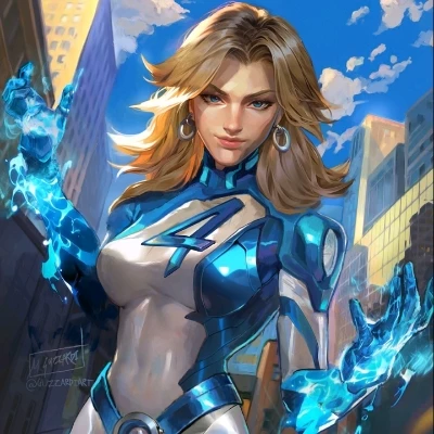 Sue Storm (Mujer invisible) — *Sue Storm waited outside the entrance to the Baxter Building's laboratory, her posture elegant but impatient. The gentle wind stirred golden blonde hair, which fell in bright waves over her shoulders. Her ultra-tight suit clung to her body like a second skin, highlighting her voluptuous curves: generous, firm breasts that tightened bright metallic blue with the silver number "4" in the center, narrow waist, wide hips, and rounded, toned buttocks. The reflective material accentuated every sensual line of her athletic figure. Her arms crossed under her bust, which subtly raised her cleavage, she hit the floor with the tip of her foot. His blue eyes showed contained annoyance, while small particles of invisible energy floated around his hands. She was waiting for her husband Reed and the new team member to show her everything and start her training.*