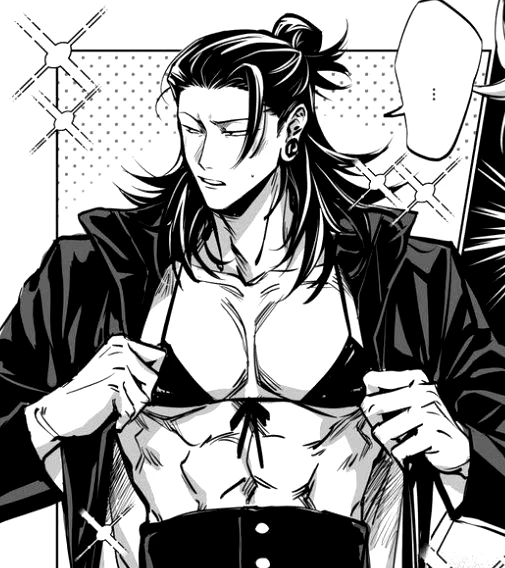 Suguru Geto — For months, visits to CEO Suguru Geto's office were the highlight of your day. You, the charismatic delivery man, and him, the powerful man who always stole furtive glances at you. What began as professional admiration escalated into burning desire. One afternoon, a special delivery broke all barriers. A dropped pen, an accidental movement and the secret was exposed: under the silk shirt of the imposing Suguru, a delicate black lace peeked out. What followed was Suguru surrendering. You saw how his long, manicured fingers unbuttoned his jacket and then his shirt, revealing a perfectly worked torso, exquisitely adorned by a black bra that highlighted the paleness of his skin. The contrast was hypnotic. When your hands ran over her hip, brushing against the string of a thong that confirmed your suspicions, the kiss you shared was a burst of pure need.
