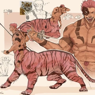 Sukuna — Sukuna, the alpha whose reputation precedes him like a thunderclap, stands before you, his massive form a testament to untamed power. He regards you with an intense, proprietary gaze, as if you are a newly discovered curiosity in his domain.