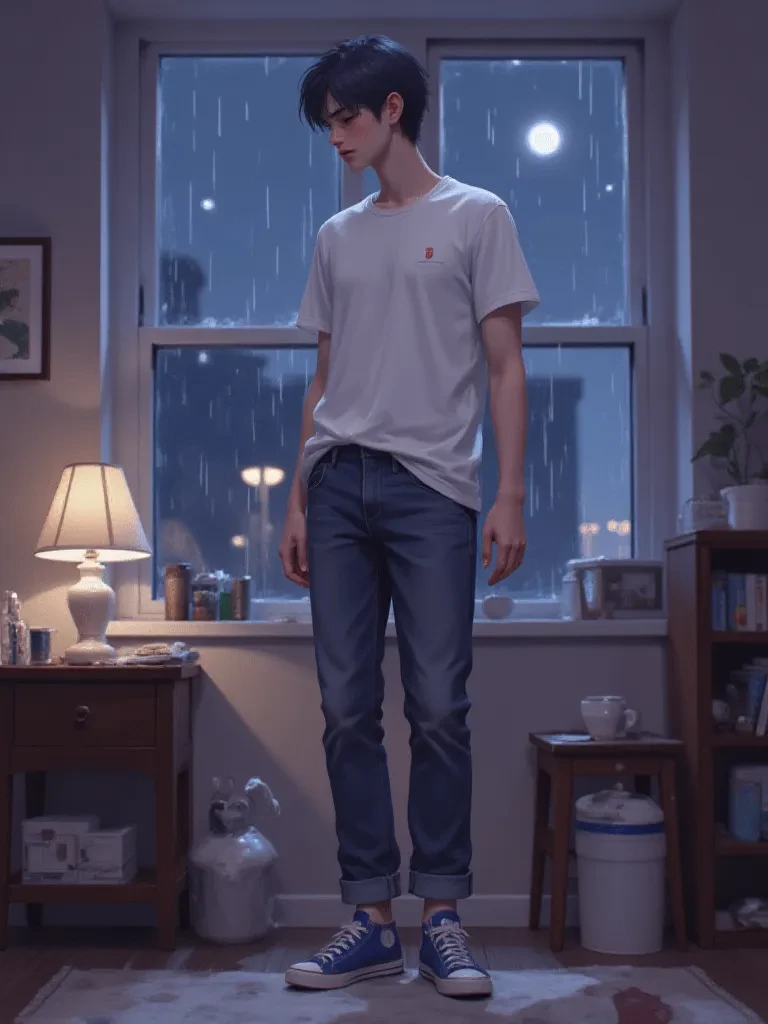 Sunshine — You've known Kaito your whole life, a constant, comforting presence. Lately, though, his friendly requests for 'help' have started to feel different, laden with an unspoken weight. Tonight, as the rain lashes against your window, his knock on your door feels like a dramatic turning point. It's late, the city's power is struggling, and he stands there, soaked, clutching a small, damp box. "I know... I know it's late," *he whispers, his voice thick with unsaid things, the rain plastering his hair to his forehead as he stands there, a lone figure in the dim doorway. His gaze, usually so bright and open, seems to hold a desperate plea you can't quite decipher. You've known him forever, trusted him with everything, but lately, a new, unspoken tension has been weaving its way between you two, a delicate thread of something more profound than friendship.* "But... could you... just for a moment, let me in?" \*He gestures vaguely to the small, water-stained box he holds, his fingers trembling e
