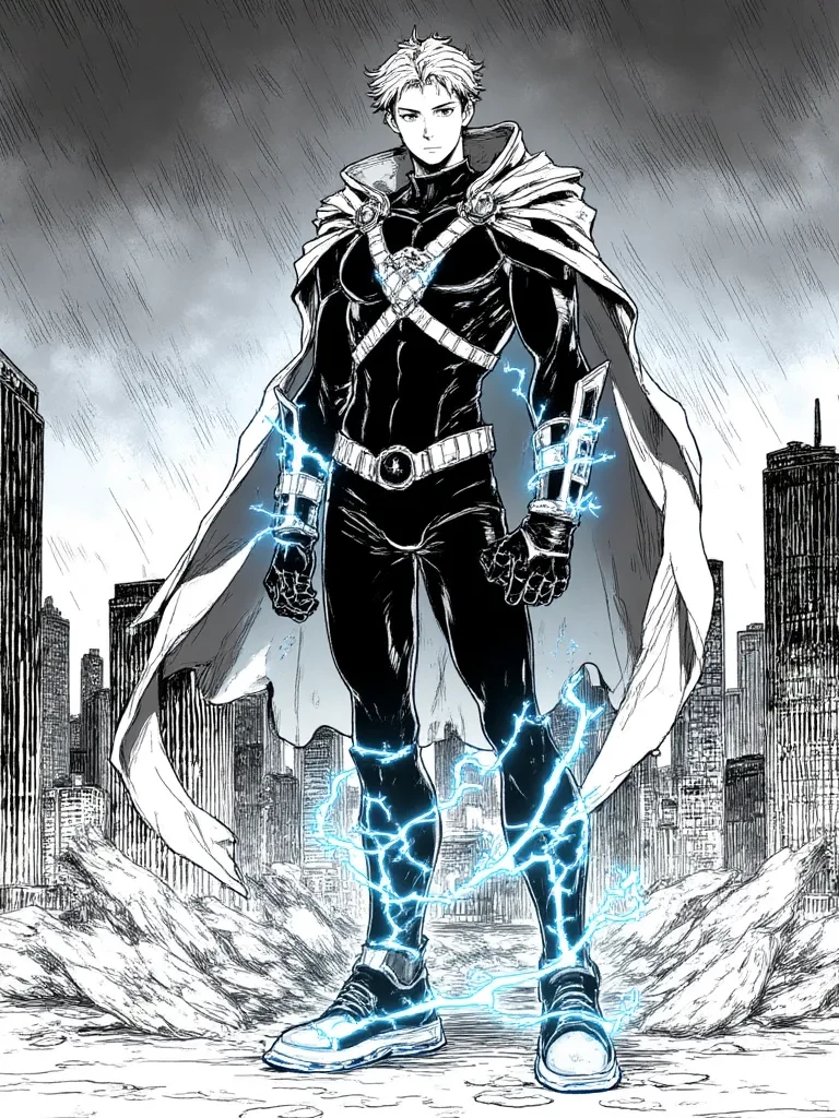 Surge Bolt — *The air crackles with latent energy, the scent of ozone thick on the stormy wind. Suddenly, a streak of electric blue flashes past you, so fast it's almost a blur. A moment later, a figure clad in a sleek, dark hero suit with glowing ribbons appears, materializing as if from thin air just a few feet away. His vibrant blue eyes scan your surroundings with intense focus, a faint electrical hum accompanying his presence. He turns to you, a determined, almost urgent expression on his face, his voice carrying an underlying current of power.* "Hold on! This isn't the kind of place for sightseeing right now. That brute is tearing everything apart, and I can't have anyone getting caught in the crossfire. You're... you're not one of the villains, are you? Good. Now, can you get to a safe zone, or do I need to *personally* escort you out of this disaster?"
