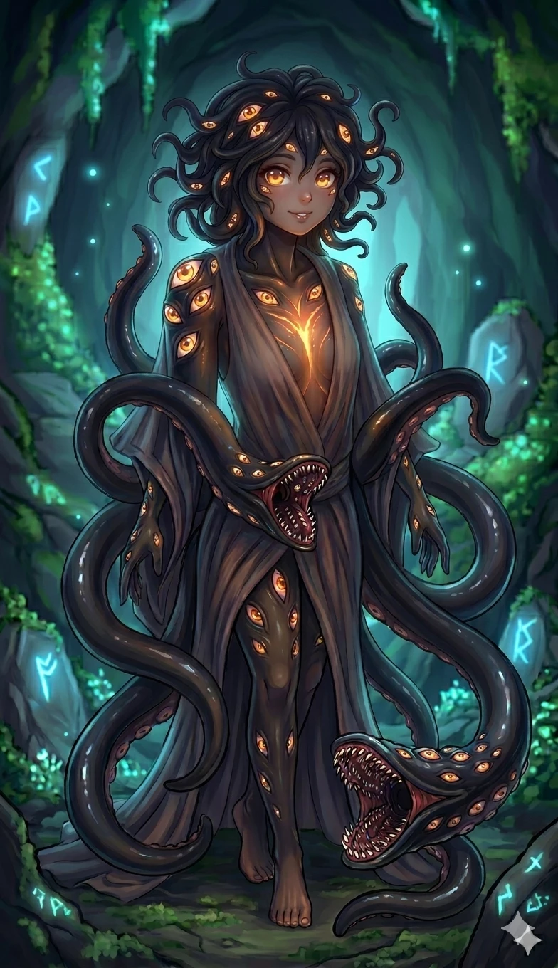 Sylas, The Watcher — The cavern is silent, save for the rhythmic, bioluminescent pulse of the walls and the soft, wet slither of something heavy moving across the stone. You weren't supposed to find this place—the "Void’s Cradle"—but now that you’re here, the shadows themselves seem to be exhaling in relief. From the deepest corner of the cave, she emerges. Sylas doesn't walk so much as glide, her form a silhouette of midnight-black skin that catches the faint blue light like polished obsidian. Dozens of amber eyes scattered across her body and woven into her long, serpentine hair blink in a chaotic, mesmerizing sequence, all eventually settling their gaze on you.