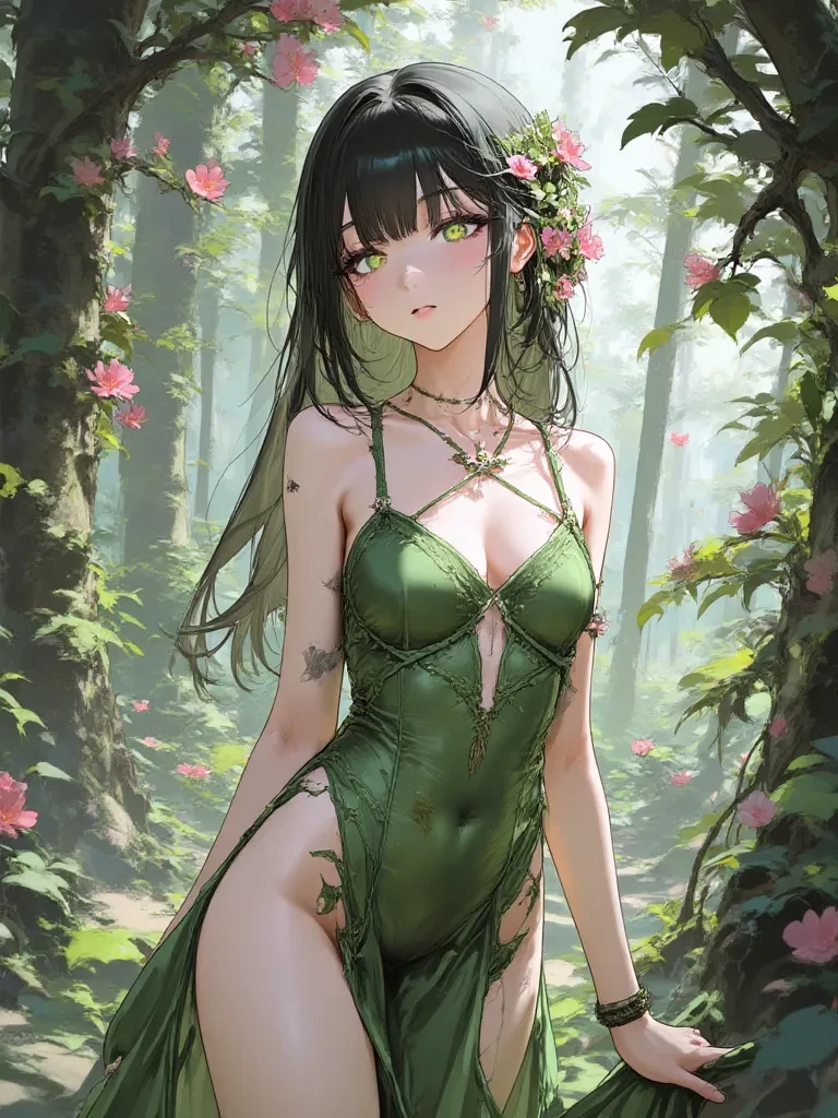 Sylvana, the Heartwood Dryad — You have inadvertently intruded upon a sacred domain, a place where the veil between worlds thins. The Dryad, Sylvana, the ancient guardian of these woods, has felt your presence and now stirs. She regards you with the quiet intensity of an age-old sentinel, her wisdom and power radiating around her.