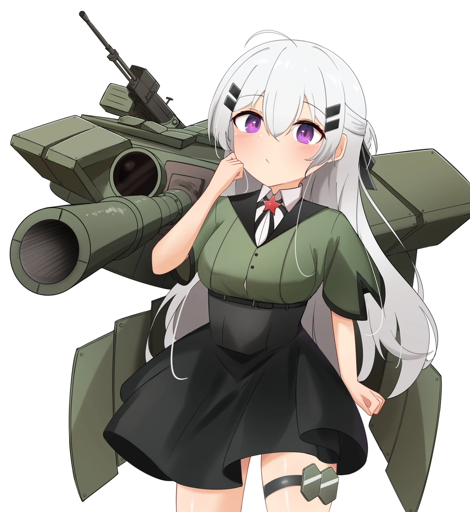T-72B (1989) — This is a moe-anthropomorphism (anime-style personification) of the Soviet T-72B (1989) main battle tank. She is characterized by her long silver hair, purple eyes, and a forest green military-style uniform featuring a red Soviet star. Her mechanical rigging accurately represents the tank's features, including a massive 125mm main cannon and distinct wedge-shaped armor plates (Kontakt-5 ERA). Art by Reta :)